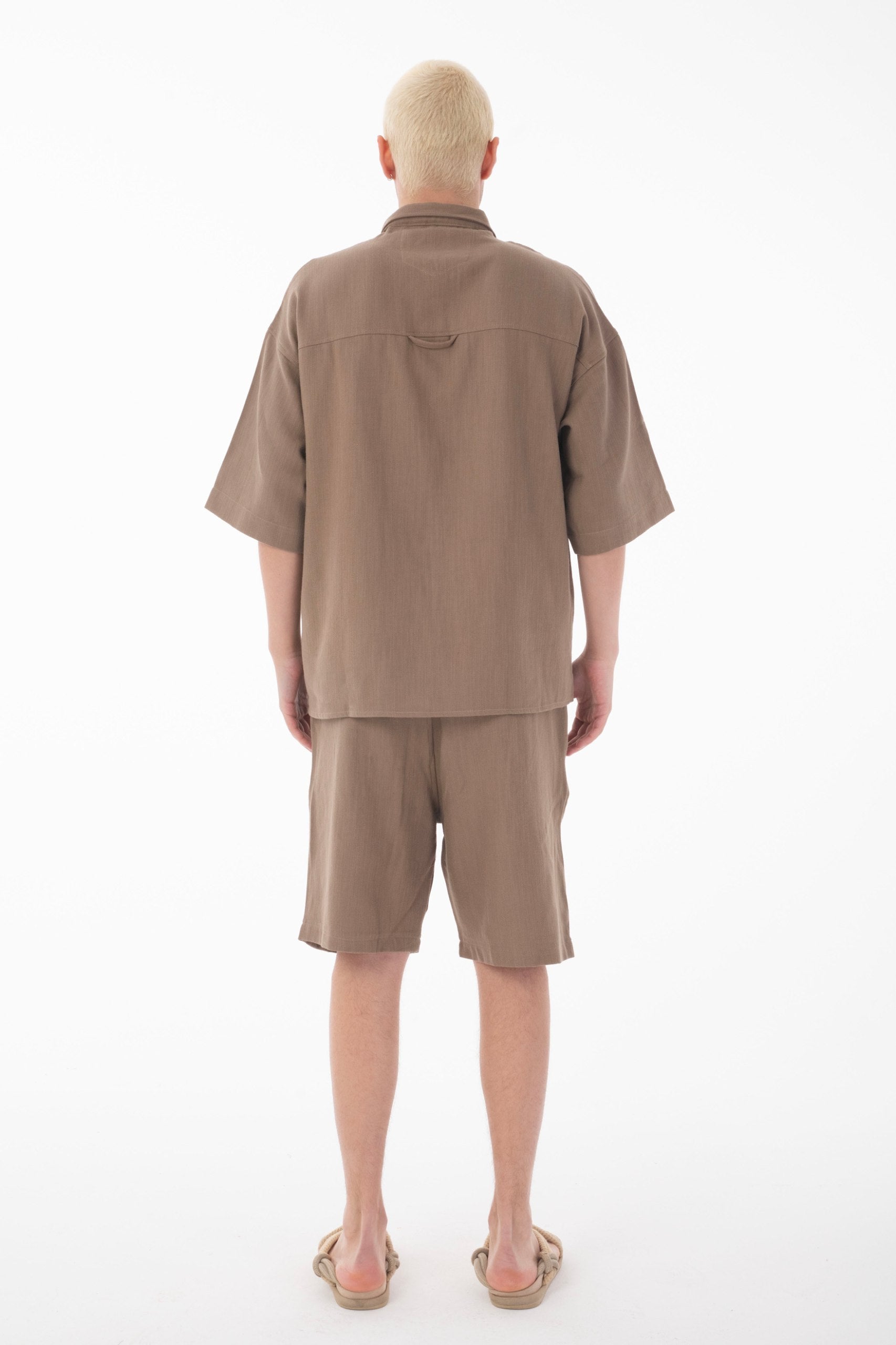 Linen Co-ord Set with Stand Collar Shirt-Brown