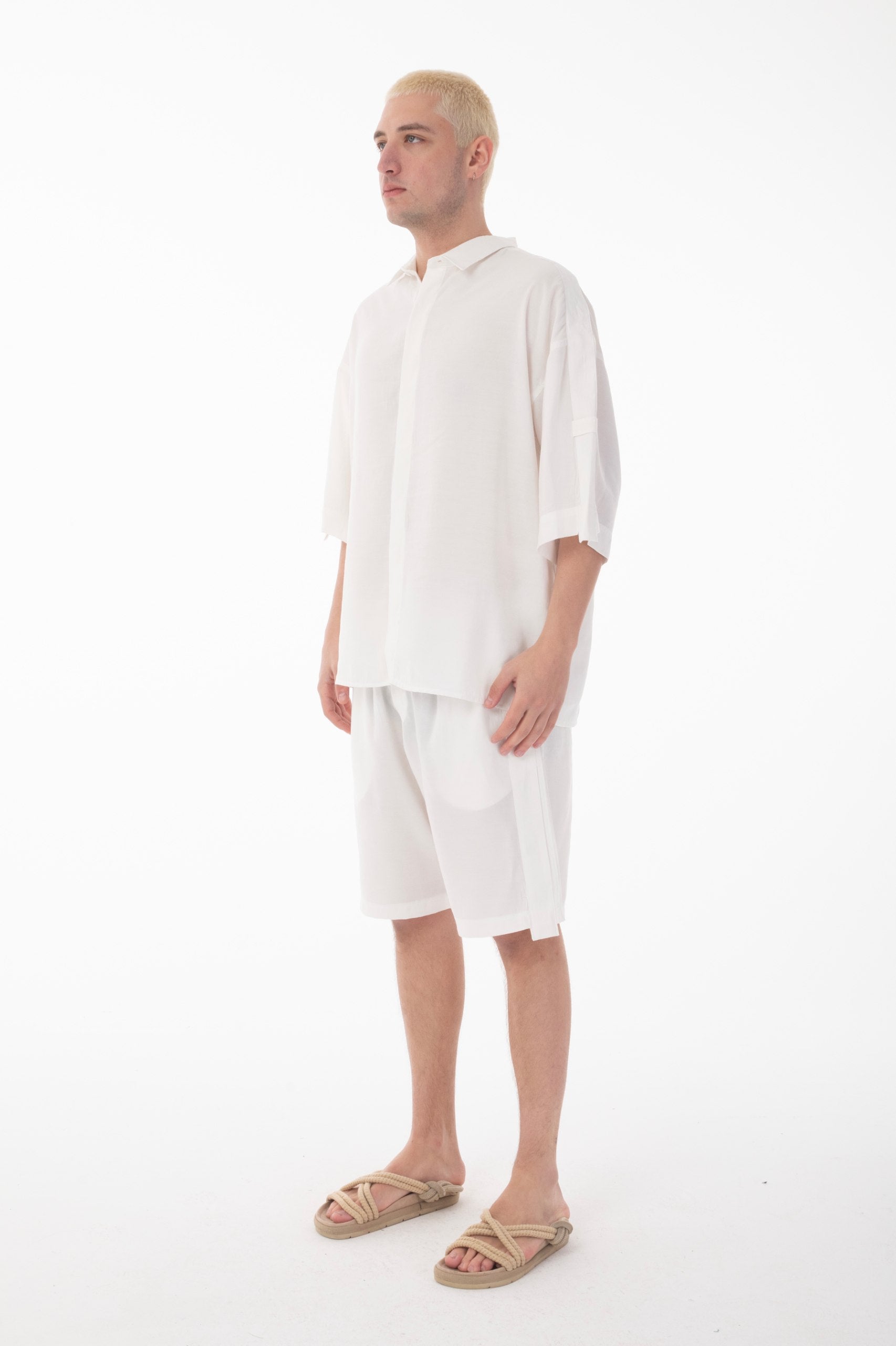 Stand Collar Modal Co-ord Set with Shirt and Shorts Details-White