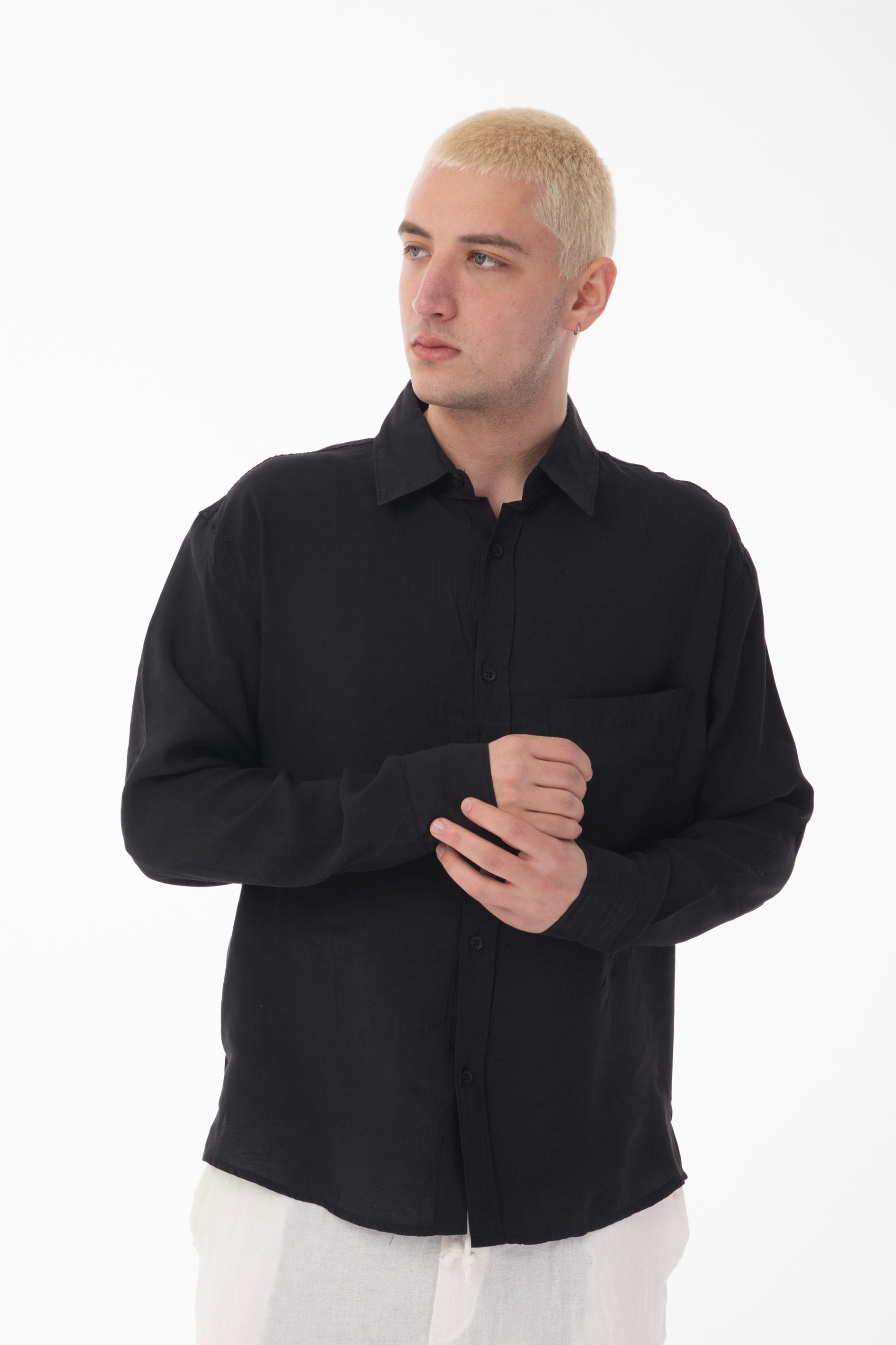 Stand Collar Single Pocket Detailed Long Sleeve Modal Shirt - Black